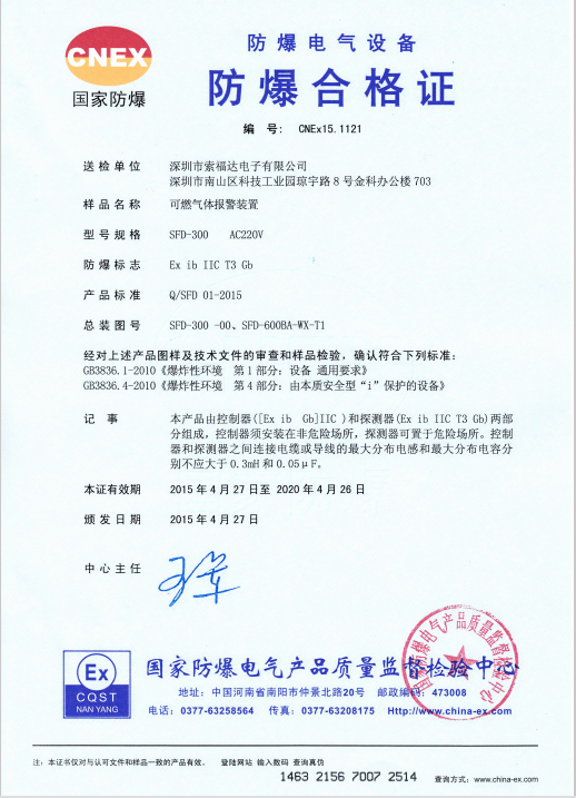 我公司送檢的點型可燃氣體探測器、報警控制器,經國家防爆電器產品質量監督中心的樣品檢驗,符合以下標準: GB3836.1-2010《爆炸性環境第1部分:設備通用要求》、GB3836.2-2010《爆炸性環境第2部分:由隔爆外殼“d”保護的設備》、GB3836.4-2010《爆炸性環境第4部分:由本質安全型“i”保護的設備》,取得了2015版防爆合格證。
