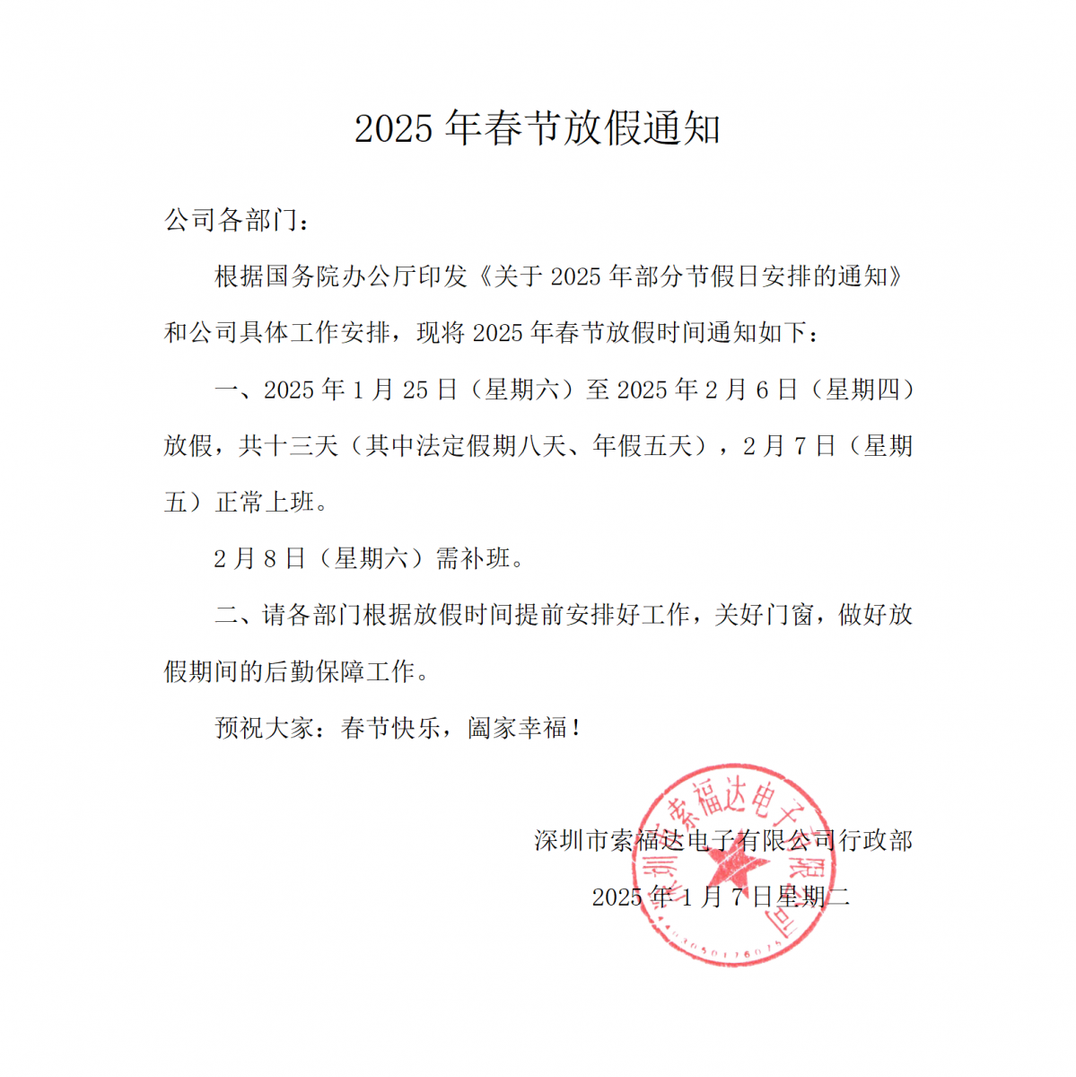 我司于2025年1月25日(星期六)至2025年2月6日(星期四)放假,共十三天,2月7日(星期五)正常上班。