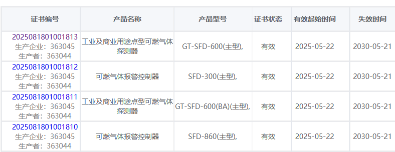GT-SFD-600、SFD-300、GT-SFD-600(BA)、SFD-860已成功取得國家強制性產(chǎn)品認證證書。